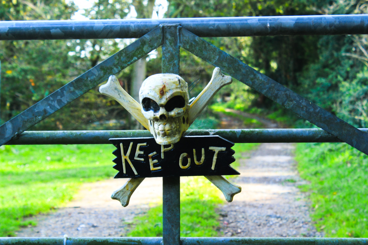 Faced with that sign, I believe I would, in fact, keep out! It makes me wonder what laws there might be about hanging an *actual* skull, with real bones, on one’s gate. Or in one’s home, for that matter. Not that I’m considering redecorating along those lines, mind you!