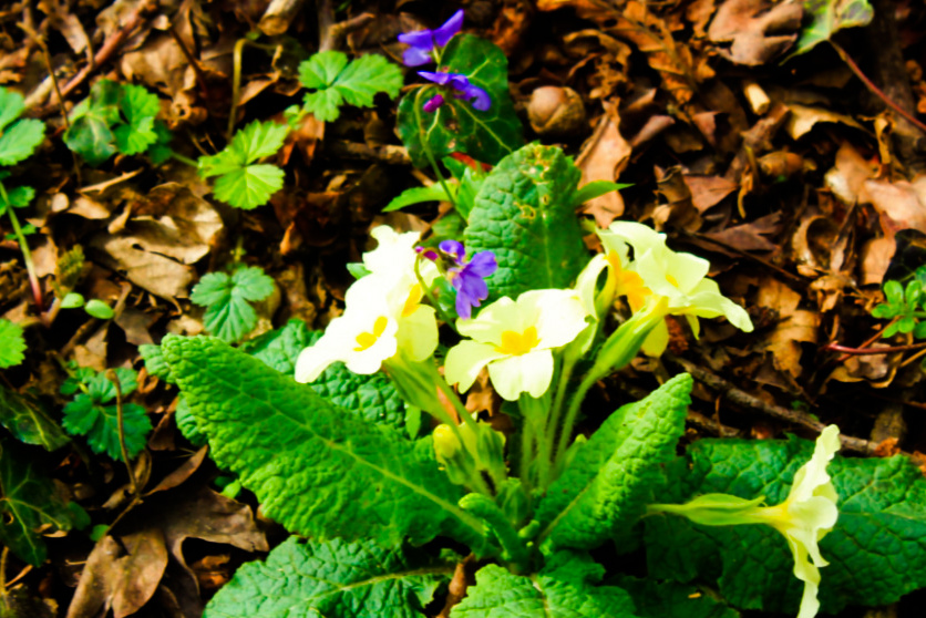 What amazes me is how delicate the primrose and violet when compared with our garden varieties, yet here they must content with what in a garden would be yanked out as weeds, and then there are dogs and walkers and chldren … how do they survive?