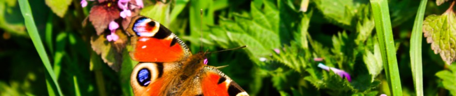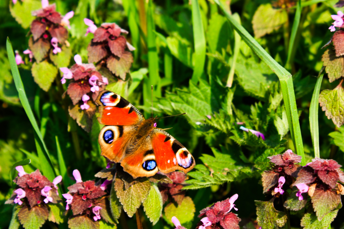 A peacock butterfly soaks up the sun amidst a bed of red dead-nettles: 17 April 2019