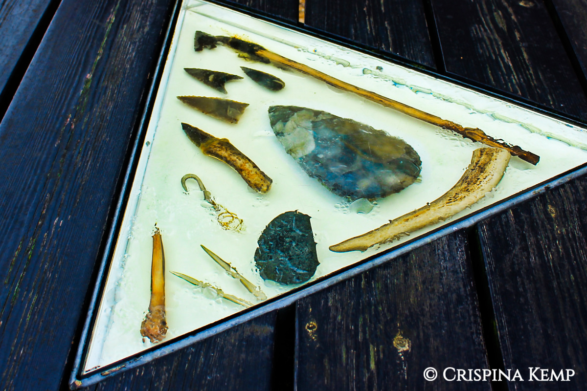 Archaeology finds featured as insets in the tables (outside) at Whitlingham Country Park. Photo taken on a very rainy day.