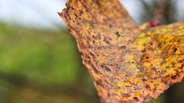But we did find a tiny spider suspended on its web above a leaf. Can you see it?