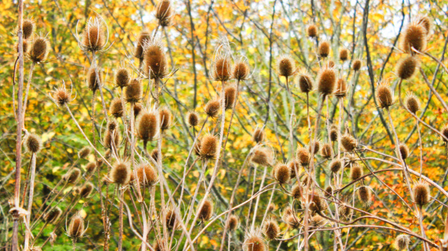And teasel, loads of teasels that formed a screen for the copper-leaved silver birch trees behind