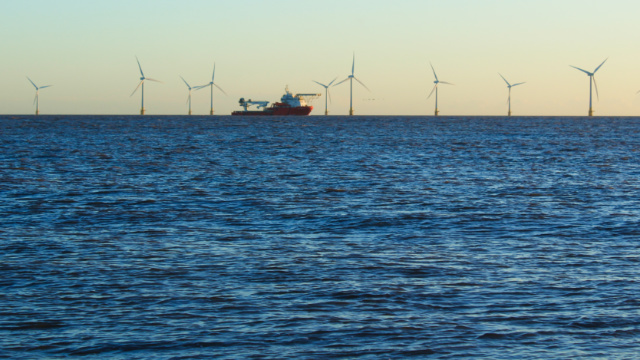 A ship passes the wind-turbines on the horizon