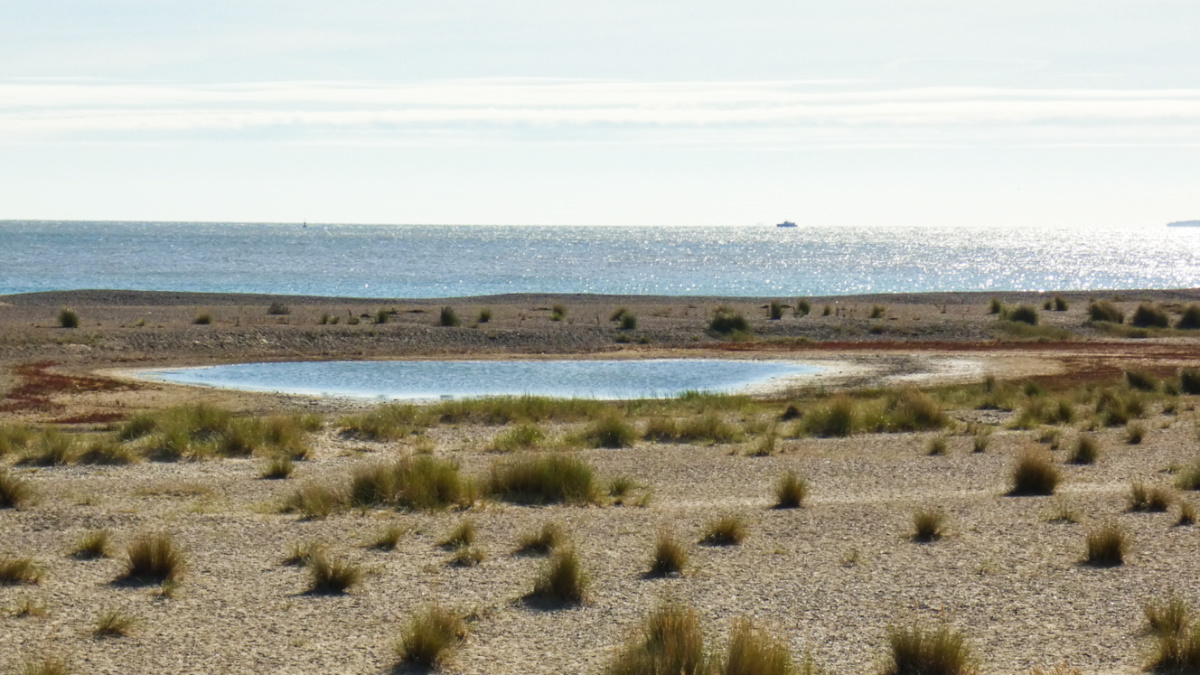 This seems to be drain-fed from the cliffs. Several feeder streams cross the dunes, their track marked by glasswort, sedge and reeds