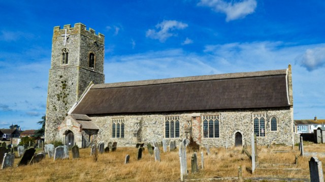 Atop the cliff, a thatched church; windows date to Tudor period: 23 Sept 2021