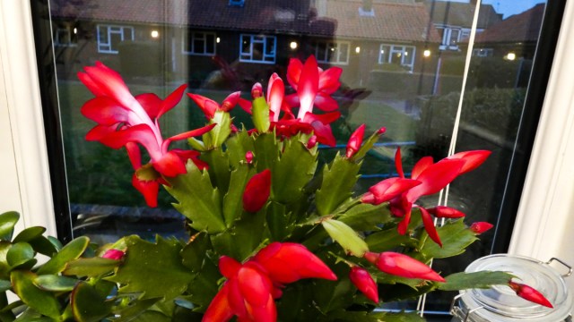 This is my Christmas Cactus. It flowered quite profusely at Christmas (when I bought it). Then t he flowers dropped off and I put it on the kitchen windowsill with my other succulents. Then comes Easter…this!