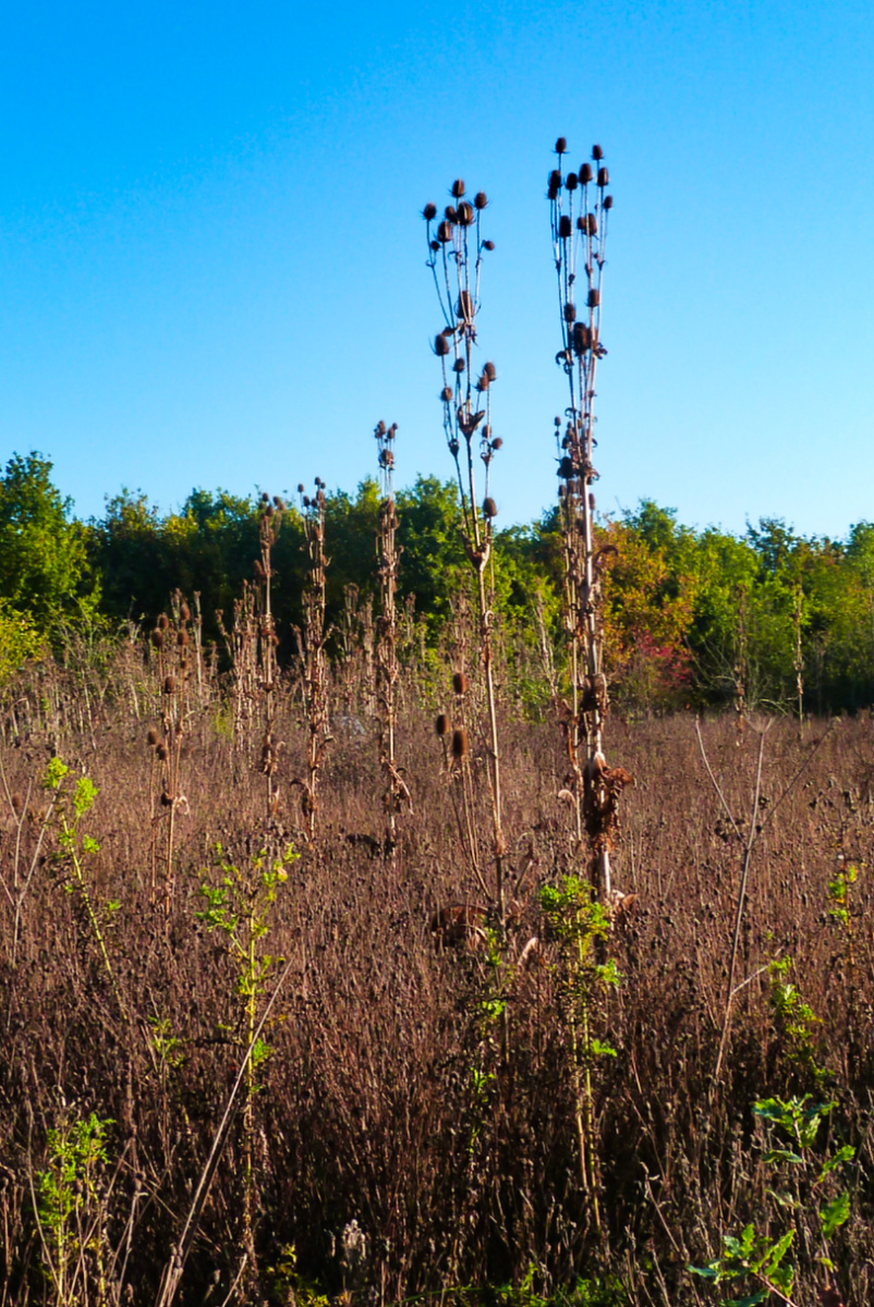At the open centre of the plantation knapweed and teasel vie for the sun’s attention. Guess the teasel wins!