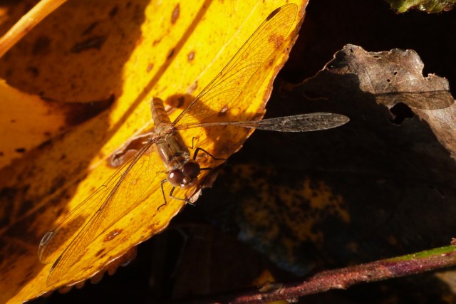 An unexpected dragonfly. And see what a vibrant leaf it has settled on. I couldn’t NOT take that photo