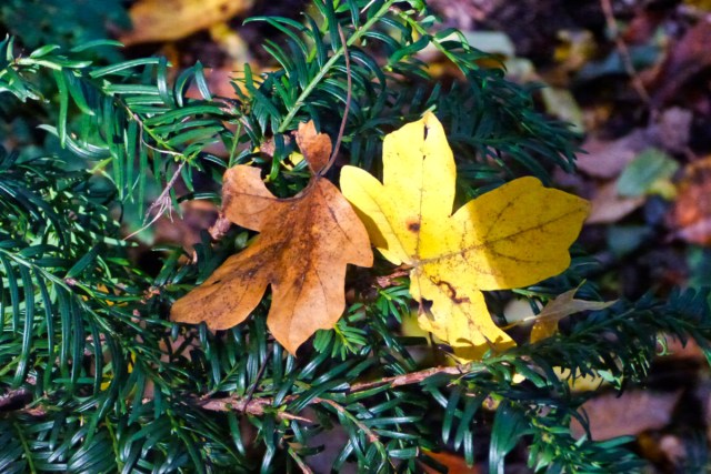 Contrasting leaves caught in the yew