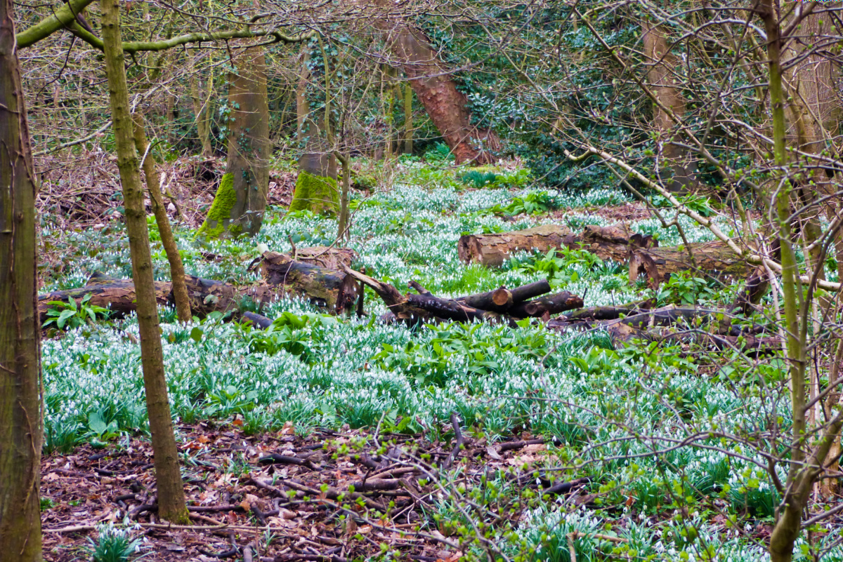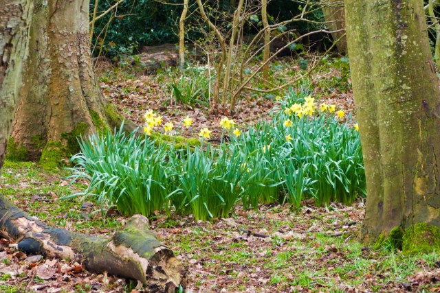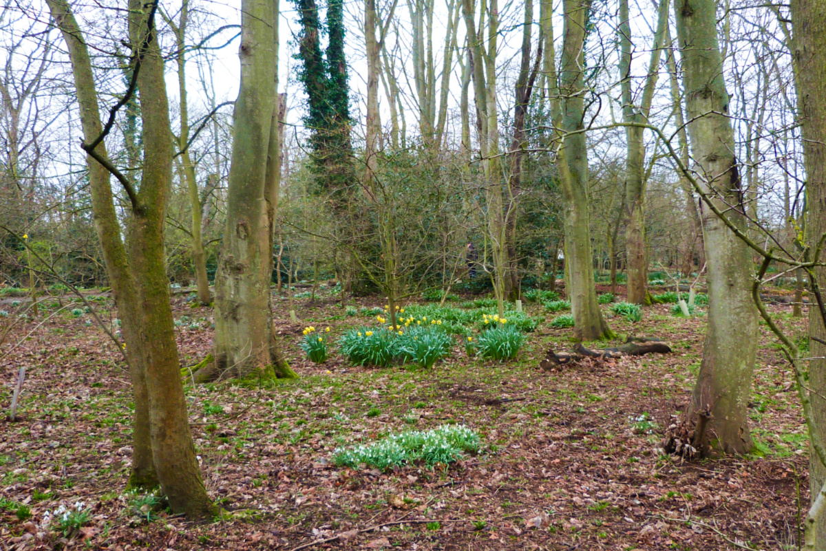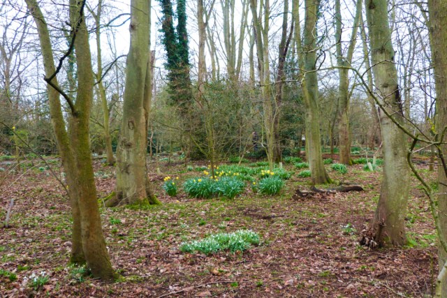 The trees hold out their naked branches, but beneath them are snowdrops, daffodils and winter aconites