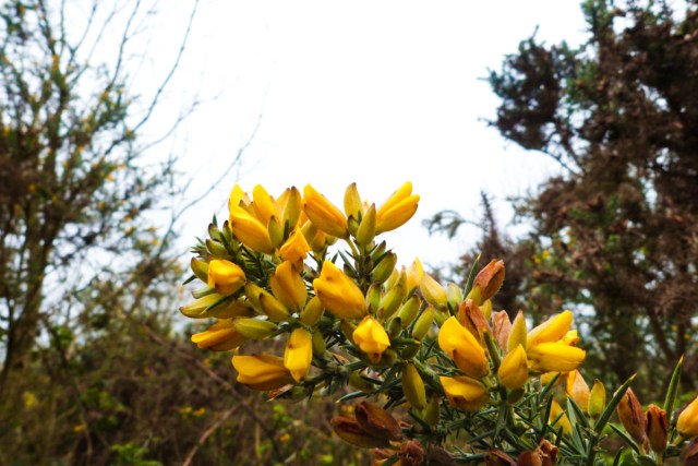 The gorse lets us know we’re in heathy country, despite we’re heading into a woodland
