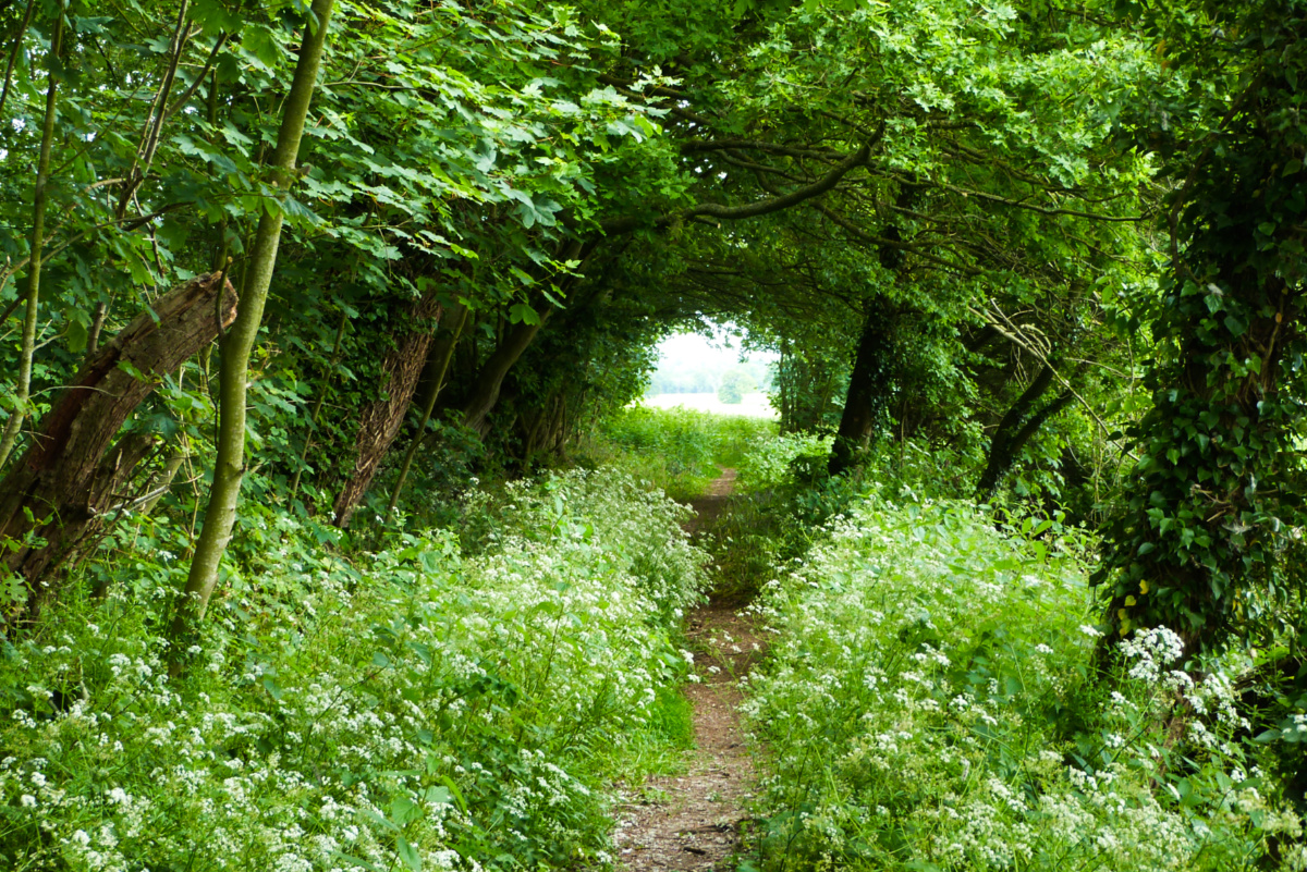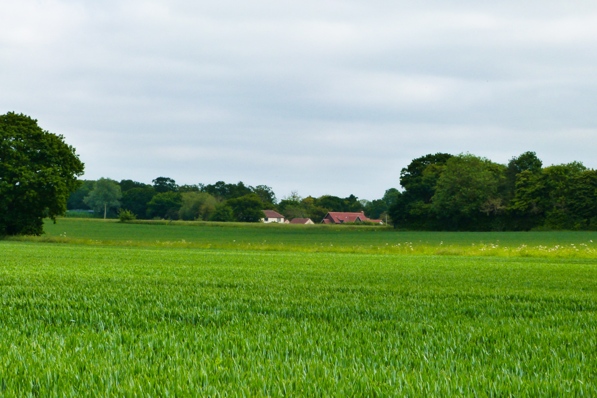 The path leads us across arable fields, the crops beautiful in their shades of green