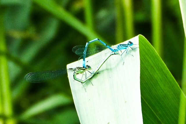 The app gives me a Latin name, and it’s not the same Latin name as my book provides: It’s a Common Blue Damselfly, getting it on with the female, that’s green.