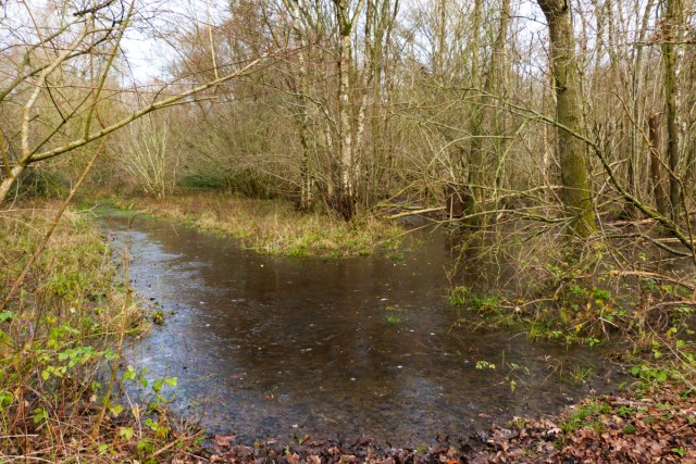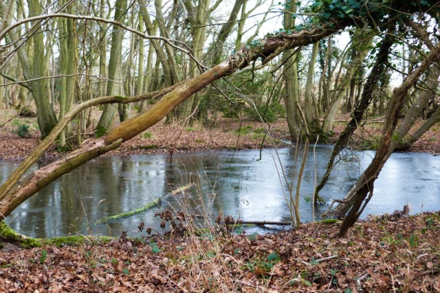 T’other side of the path is Hethel Great Wood. It is flooded, and floods are frozen. But at least it’s warmer out of the wind