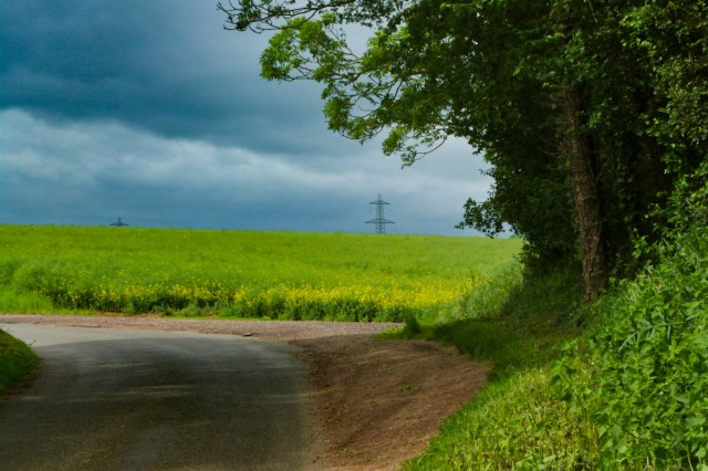 The rather narrow rural lane takes us alongside an Iron Age hillfort (invisible here to the right)… and down and round and down we go into the Tas Valley