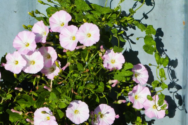Magnificent bindweed climbing high on this mugwort contrasts with this pretty little field bindweed that’s climbing the metal sea wall