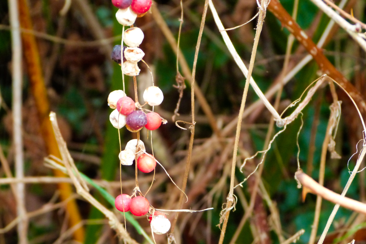 Alas, these bryony berries haven’t been allowed to ripen. Not sure what’s happened to them but I rather like the muted colours