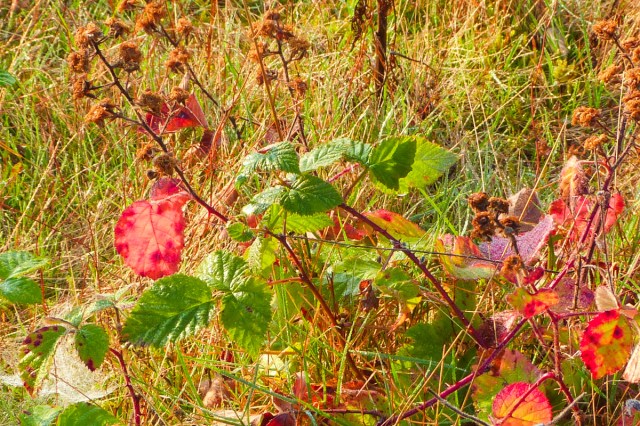 I do love to see these crimson blackberry leaves at this time of year. And those tiny fungi we nearly stand upon