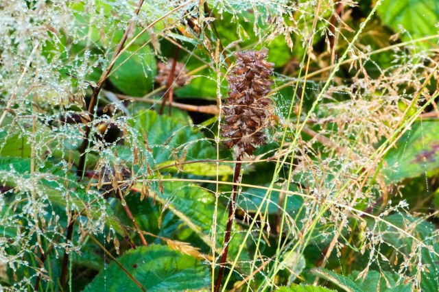 In a dew-drenched meadow, self-heal seed heads and delicate grasses…and a spider’s web draped over the brambles