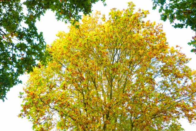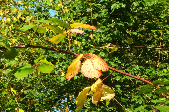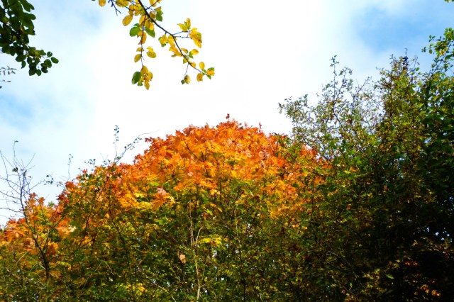 Above: Maple. This is not a native tree. Below: A rarity, an oak decked in golden leaves while its neighbours mostly retain their green