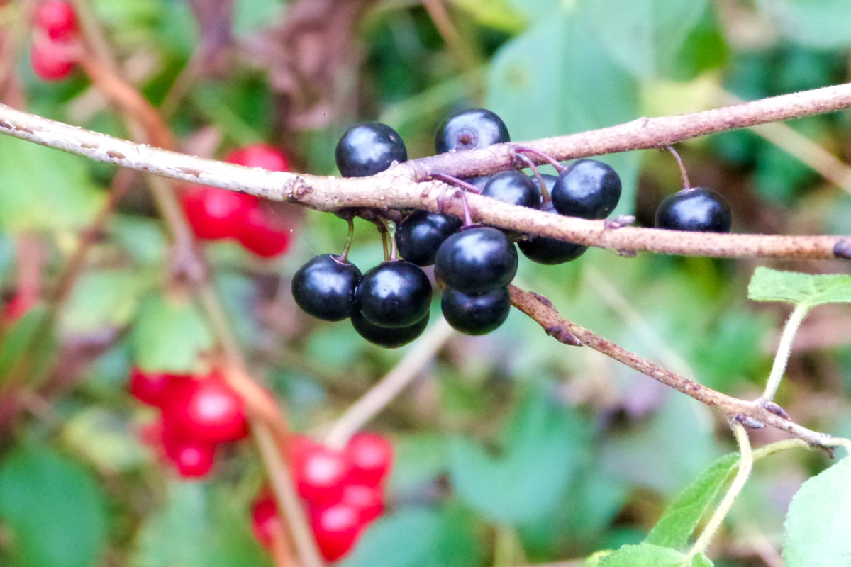 At first I thought these were rose hips. But they’re honeysuckle berries.