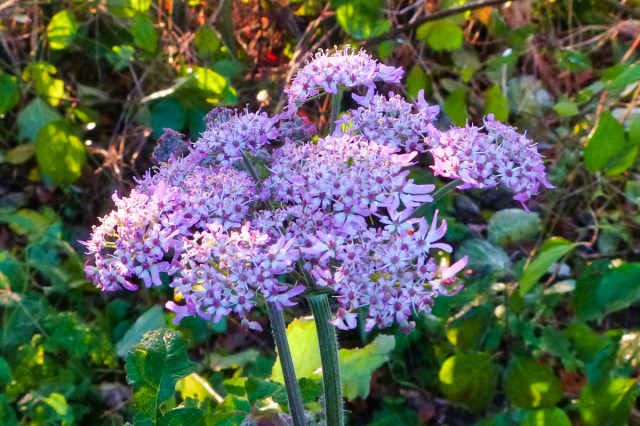 Above: Hawthorn foliage amaze me with the colours that show at this season. Below: This is hogweed again, but the special pink/purple form that’s a specialty of our county