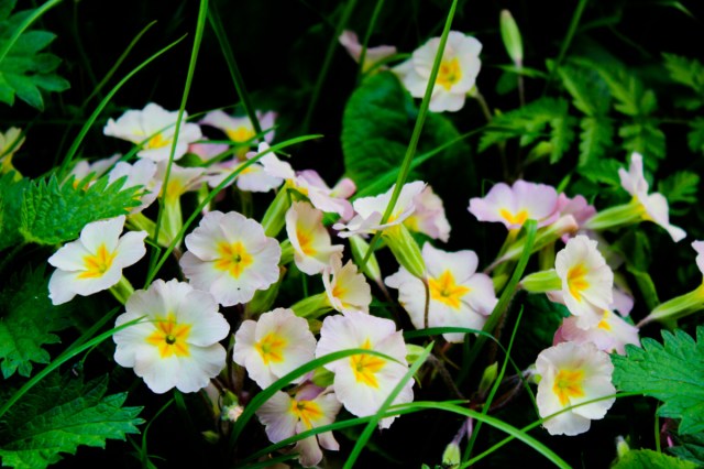 Above: Alexanders flourish wherever the Romans set their kitchens! It’s the first of the umbellifers to flower (in acid yellow) Below: This (very pale) purple form primrose is a naturalised garden escapee. Wide patches give colour to the hedgerows