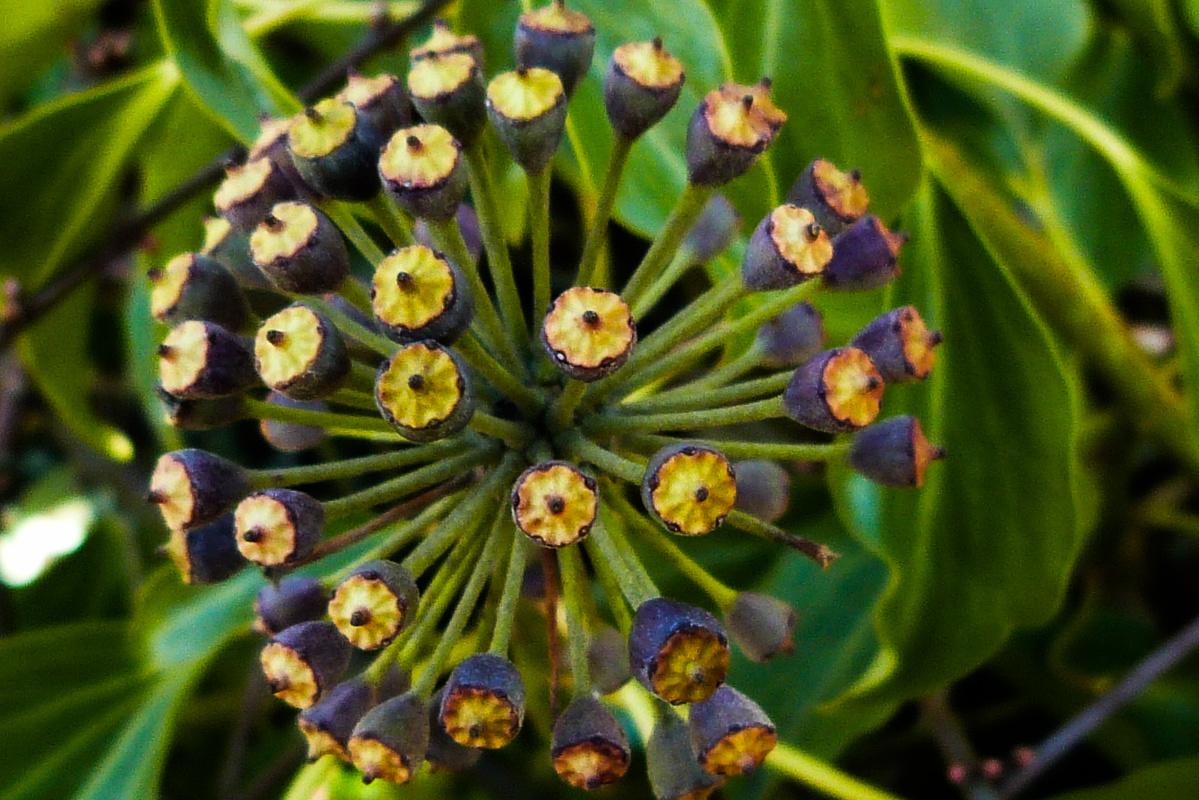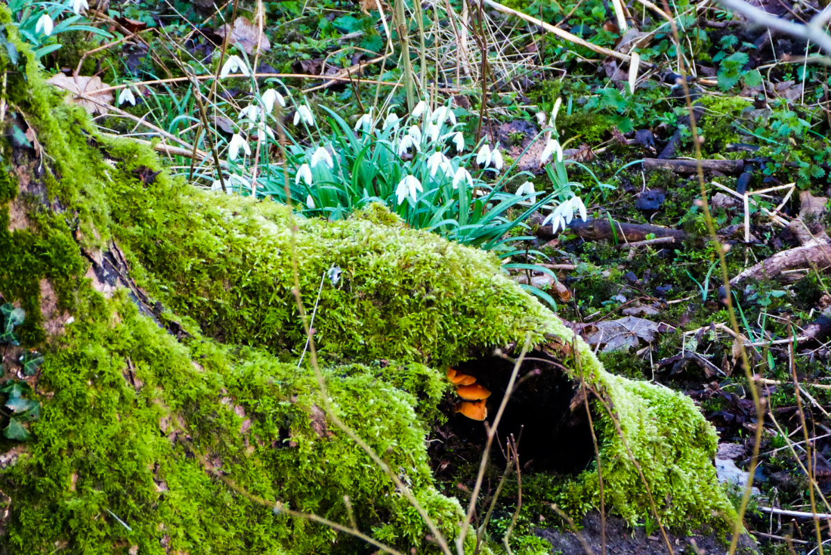 Wonderful blooms and that ivy berries ball is so cool! Love the cape of green moss below the snowdrops and protecting the fungi. Gorgeous shot.