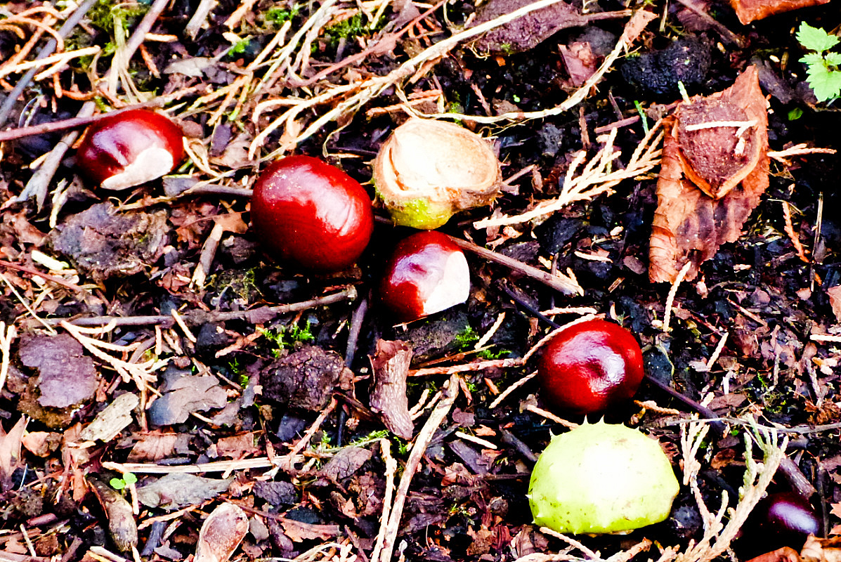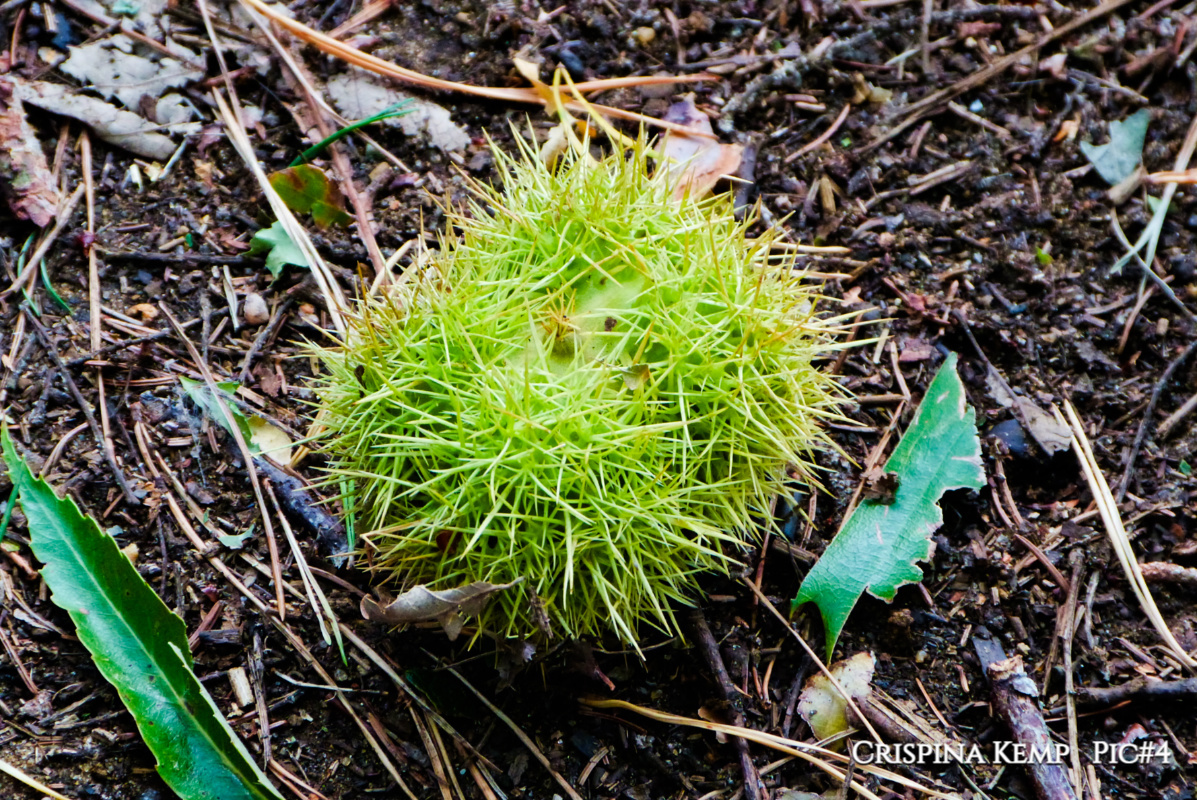 The chestnuts are still hidden in the prickly husks. We checked on a few but the nuts were very small and nothing like ripe. They’d been brought down by the recent winds ๐ฝ