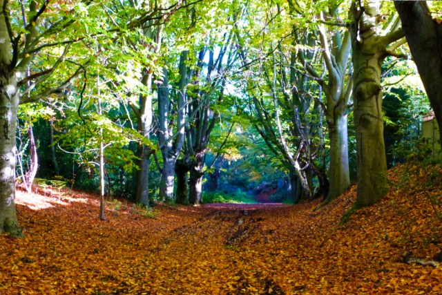 🔼🔽 The heath is divided by that twisty-turny road (above). We enter the east side first, because we know there we’ll be walking along this wonderful beech-lined avenue. There are still plentiful tenacious leaves on the trees, but also a wonderful copper carpet