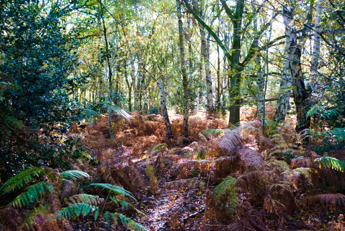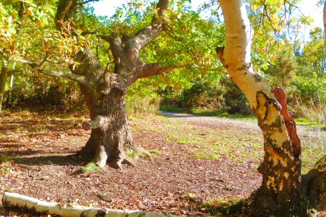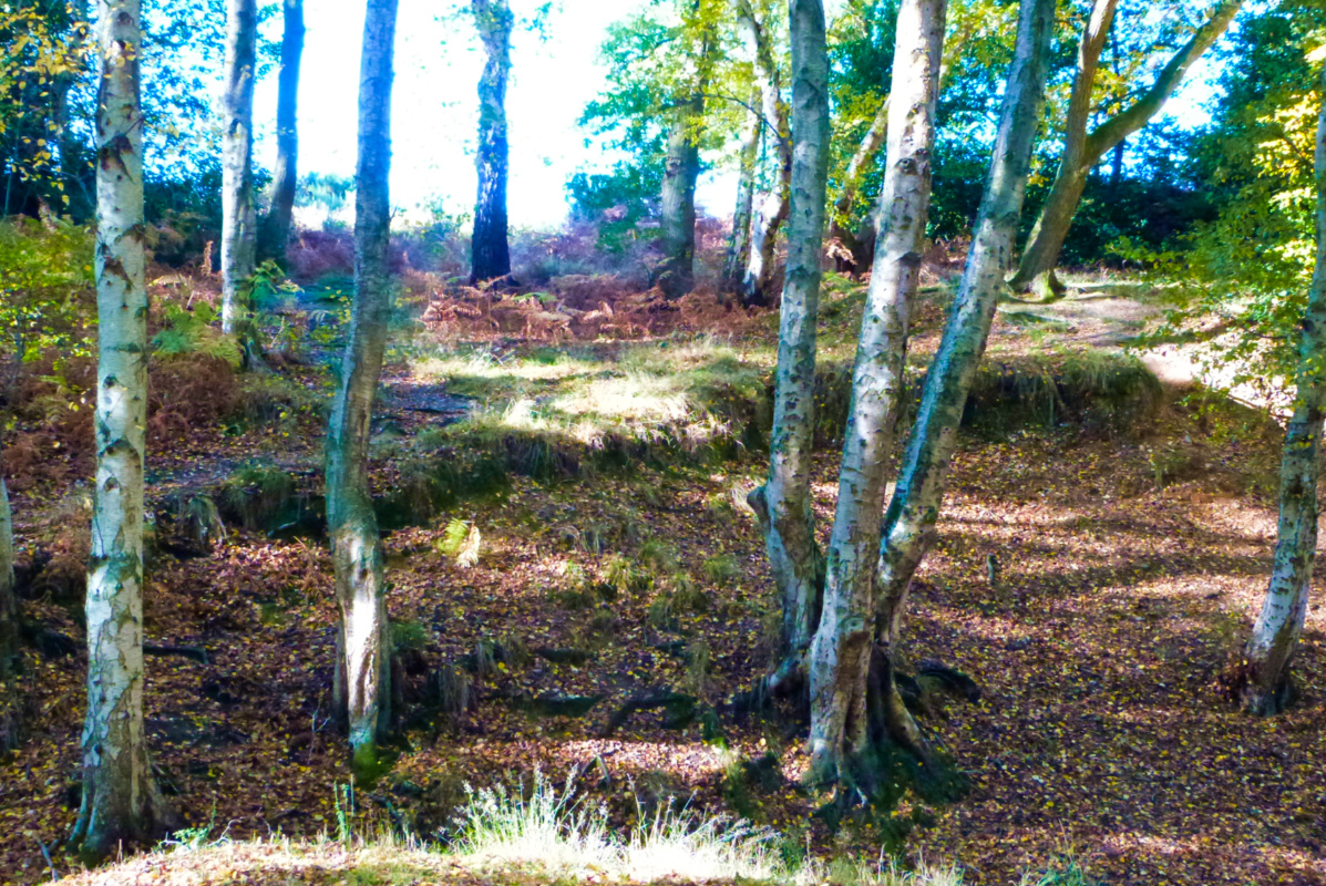 🔼 Into the western side of the heath, many of the trees are more recently established; areas of sparkling light as the sun catches the young birch bark, undergrown with the coppery fronds of bracken 🔽 But in a sunny glade are older birches with their gnarly barks