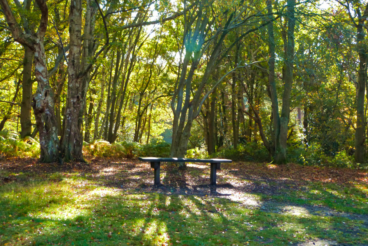 🔼 At the highest point a gorse-covered heathland spreads out, birches and oak trees hugging the outer path. There are benches here, a pleasant place to rest awhile 🔽