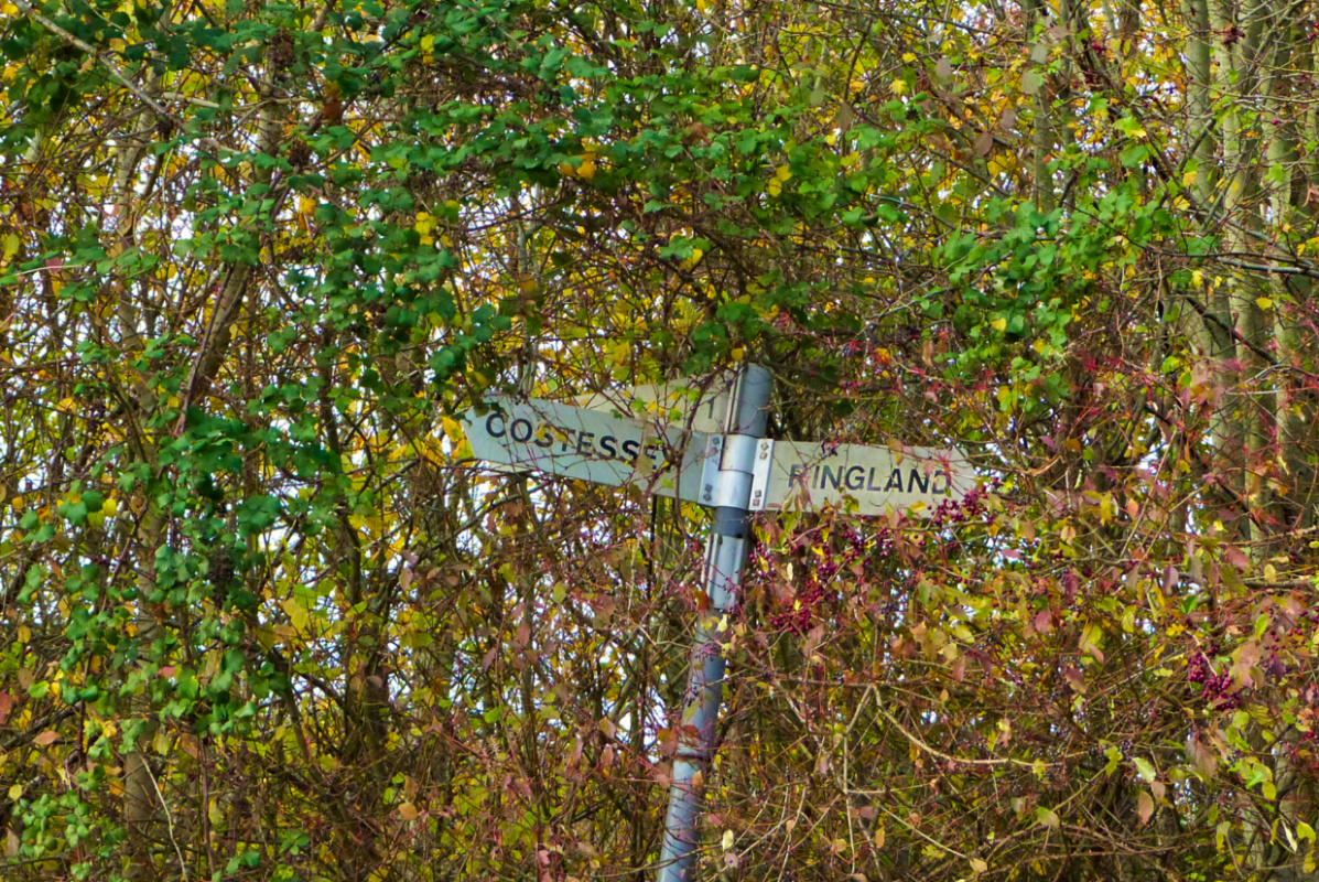🔼 Signage, I love signage. Not sure anyone in need of direction would be able to read this. The obscured arm says ‘Easton’ 🔽 I’ve looked and looked at this busy picture but still can’t name the main plants. Catkins, probably birch. Those leaves? The berries? Surely not grapes? Not in a hedge a fair distance away from habitation. Anyone care to give me a better guess?