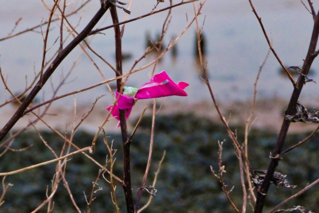 ๐ผ Desperate for colour I snap at anything! I do wonder who’s tied this sweet-wrapper there, and whyย ๐ฝ As to this post… no, it’s clearly a face!