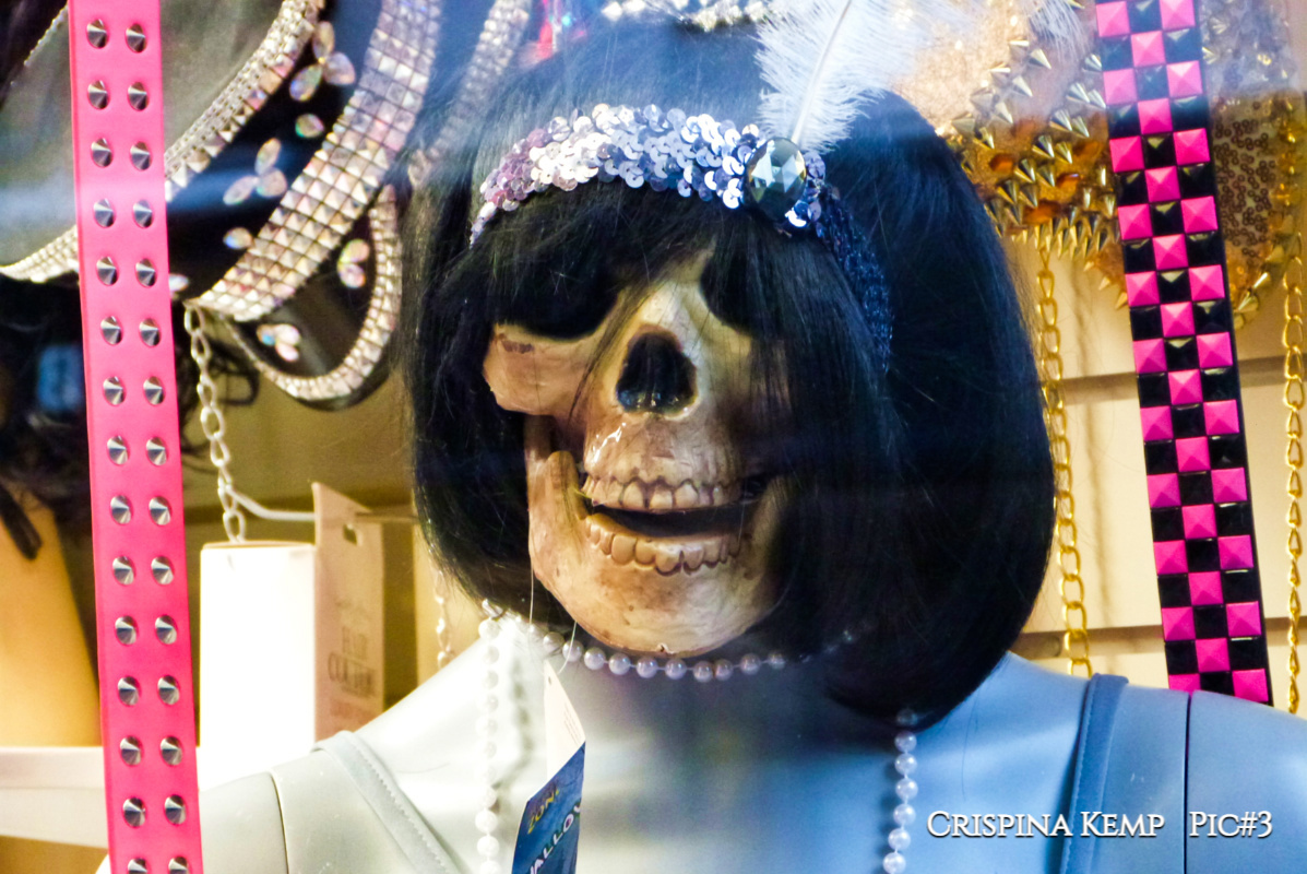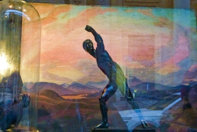 Taking photos through shop windows, not something that always works 🔼 A Greek athlete poses in front of a painting of sunrise over a mountain-scape in an antique shop 🔽 A shop of glitter and jangles