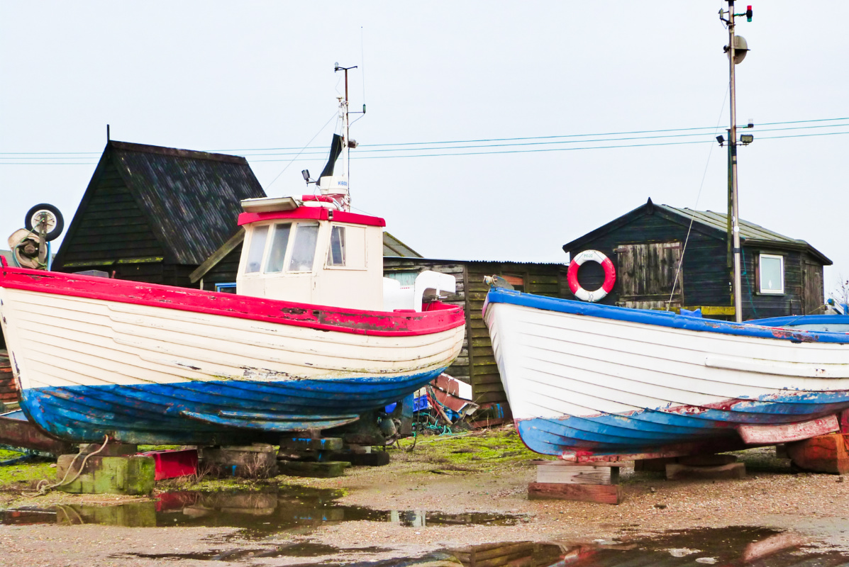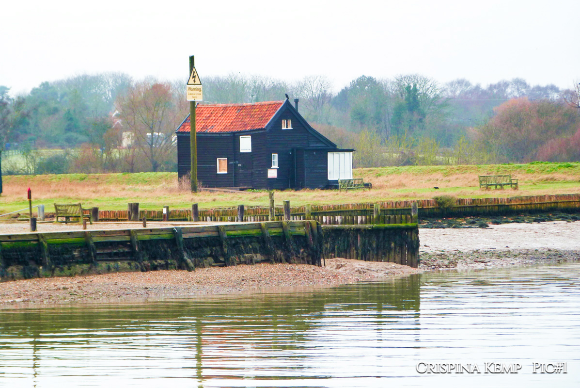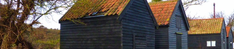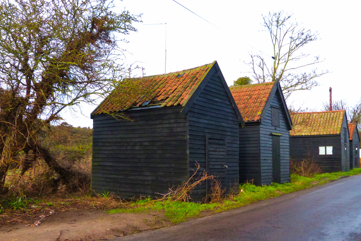 Then it’s off down the road to the river. π½ A footpath branches off here to cross the common (too wet to be taken at the time of year!) but these sheds fascinate me. The black boards are typical of the fishing community here and with those red tile roofs they make quite a sight