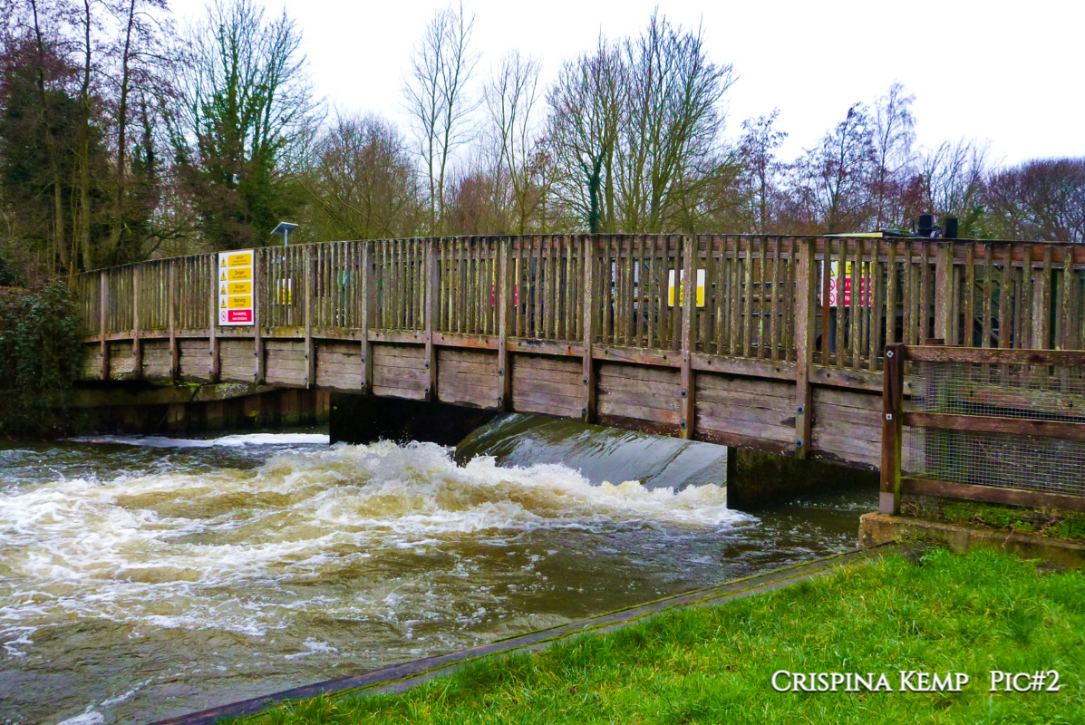 🔼 The placid river 🔽 The gush as that water rushes through the weir