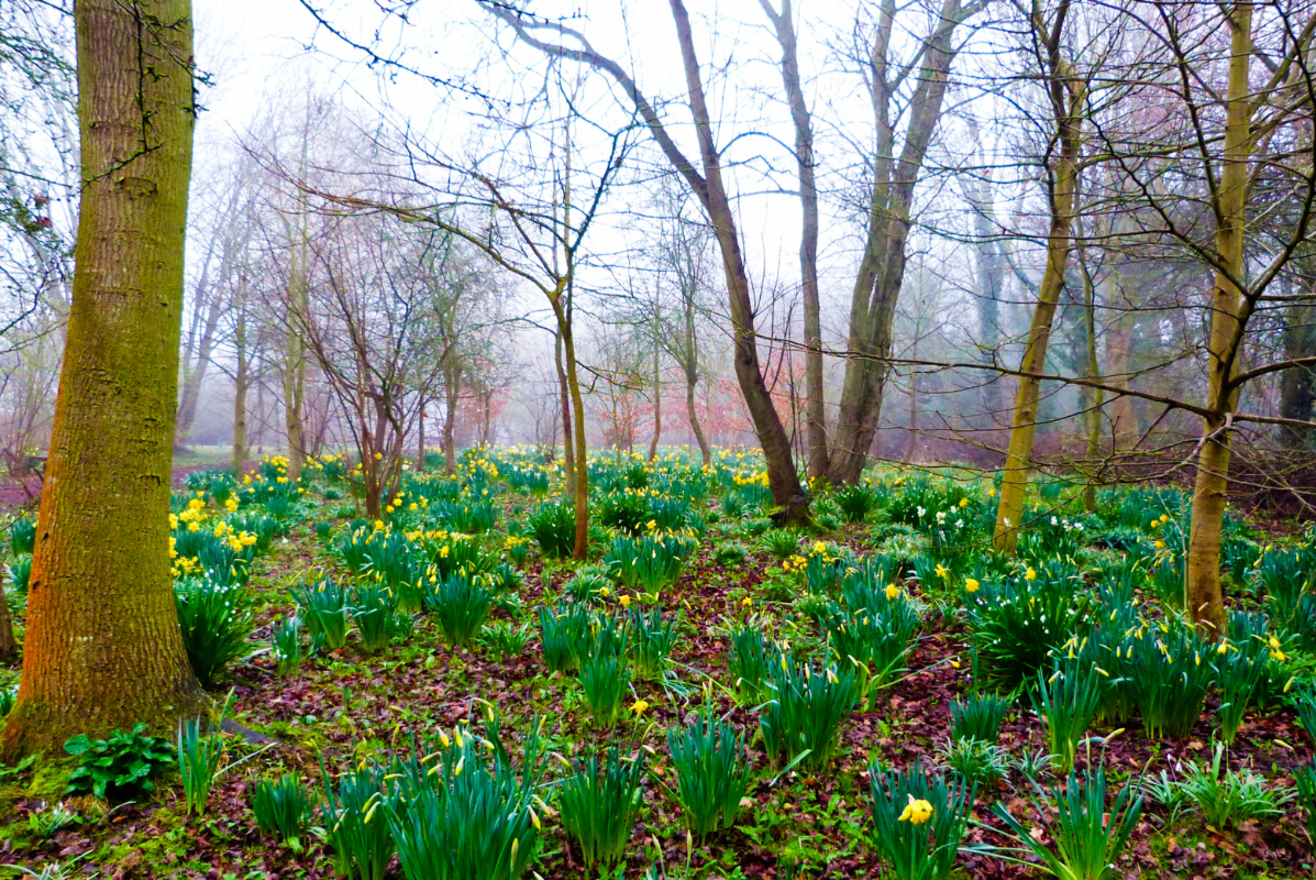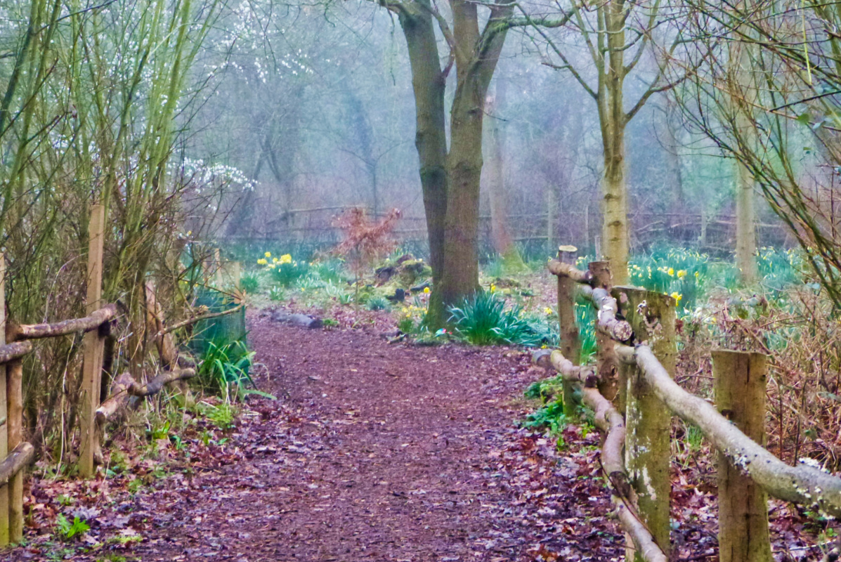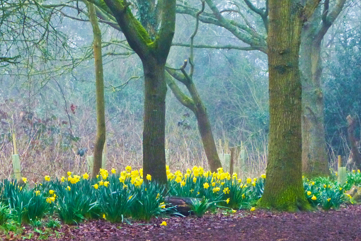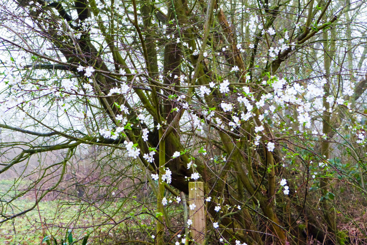 🔼 Into the woods-proper, mist thickening, more daffs 🔽 Flowers and leaves together, this must be a cherry-plum tree but we’ve never visited when it’s in fruit to confirm that