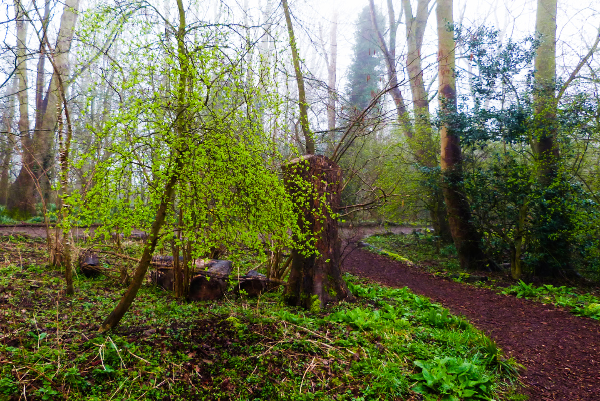 🔼 No sign yet of the mist dissolving… 🔽 but plentiful signs of spring arriving with leaves now erupting